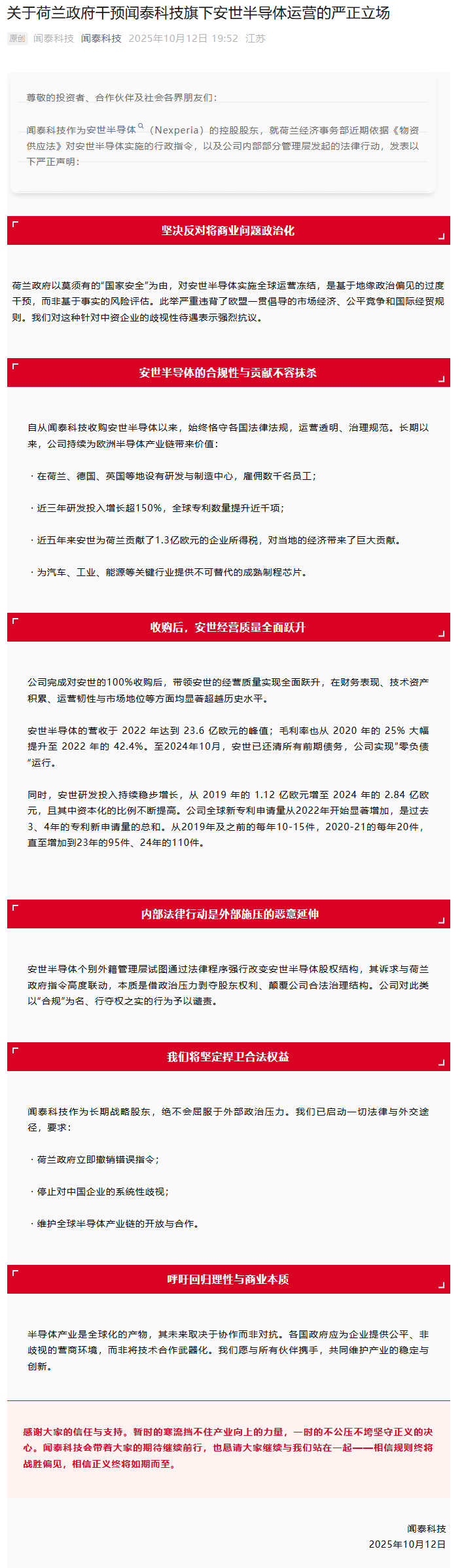 10月12日晚,闻泰科技发表声明称,荷兰政府以莫须有的“国家安全”为由,对安世半导体实施全球运营冻结,是基于地缘政治偏见的过度干预,而非基于事实的风险评估。此举严重违背了欧盟一贯倡导的市场经济、公平竞争和国际经贸规则。安世半导体个别外籍管理层试图通过法律程序强行改变安世半导体股权结构,其诉求与荷兰政府指令高度联动亚金配资,本质是借政治压力剥夺股东权利、颠覆公司合法治理结构。公司对此类以“合规”为名、行夺权之实的行为予以谴责。